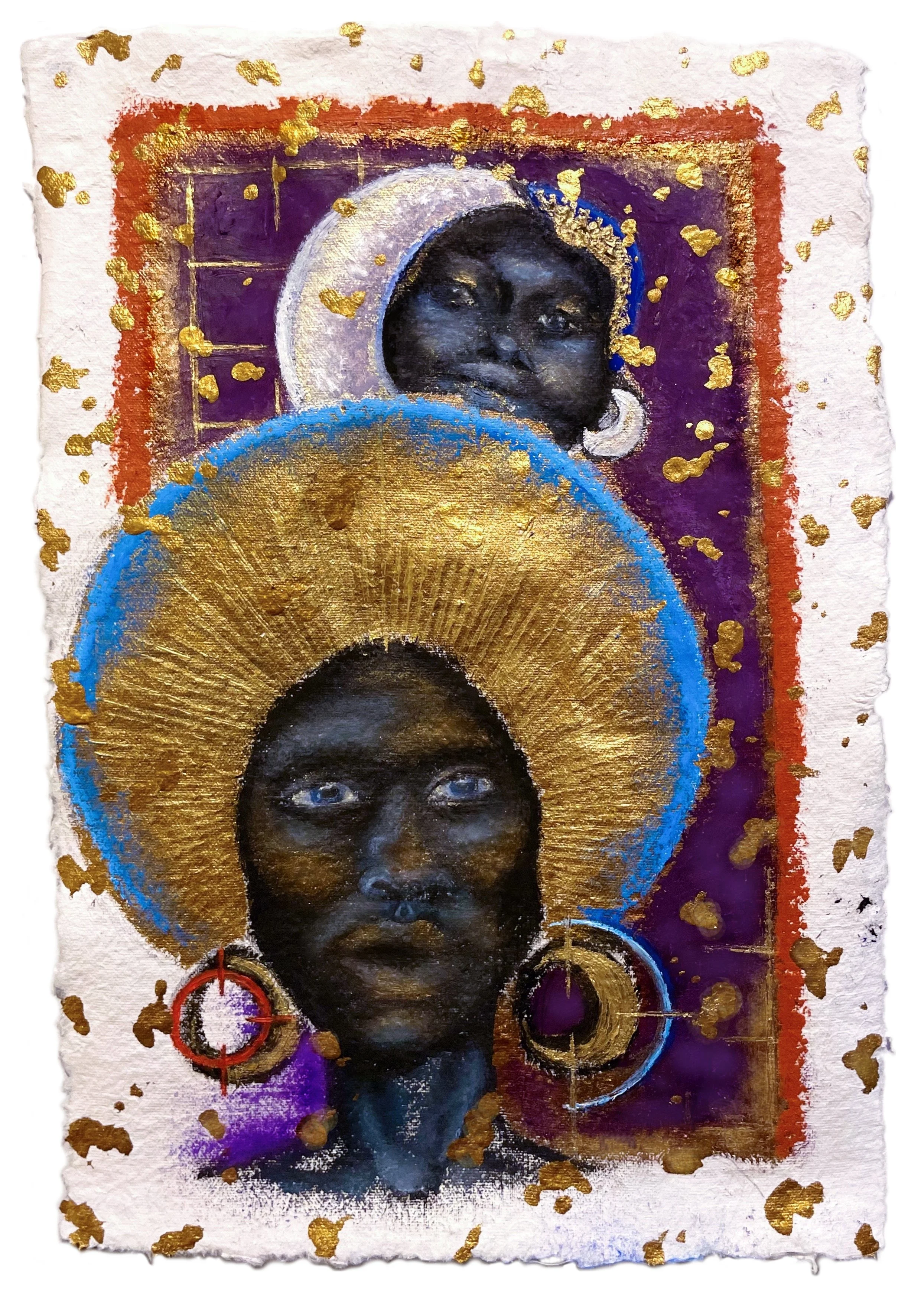 Oil, Acrylic, Oil Pastels and Metallic Paint on Gold Speckled Lamali Paper